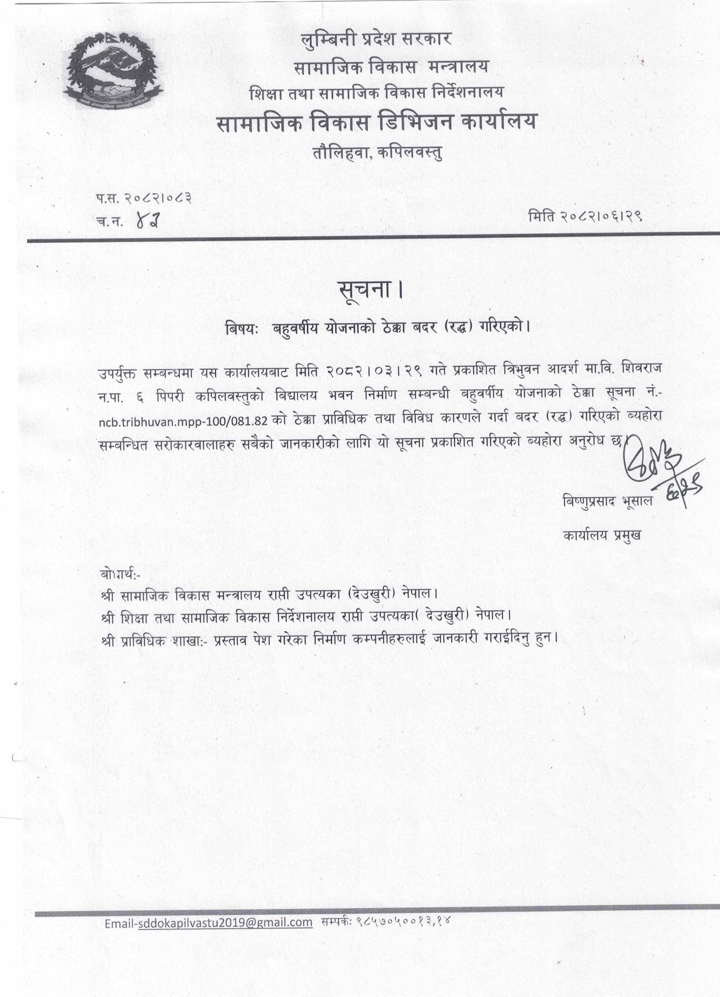 | 11 | प्रस्ताव पेश गर्ने बारेको सूचना । | अन्य | 2082-01-16 | सामाजिक विकास डिभिजन कार्यालय तौलिहवा, कपिलवस्तु । | View |