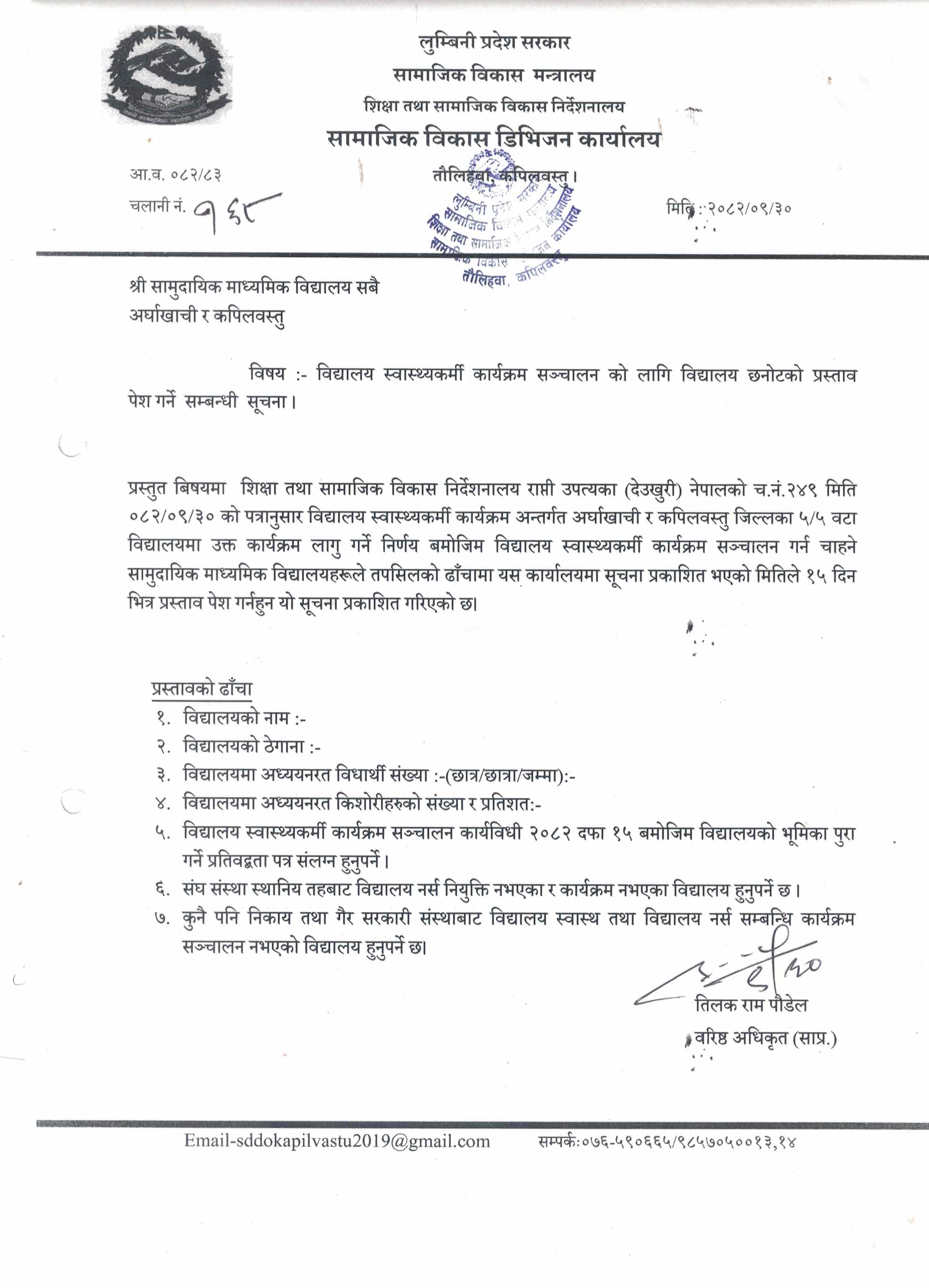 | 5 | - विद्यालय स्वास्थ्यकर्मी कार्यक्रम सञ्चालन को लागि विद्यालय छनोटको प्रस्ताव पेश गर्ने सम्बन्धी सूचना । | सूचना तथा समाचारहरु | 2082-10-01 | सामाजिक विकास डिभिजन कार्यालय कपिलवस्तु नगरपालिका ३ तौलिहवा , कपिलवस्तु | View |
