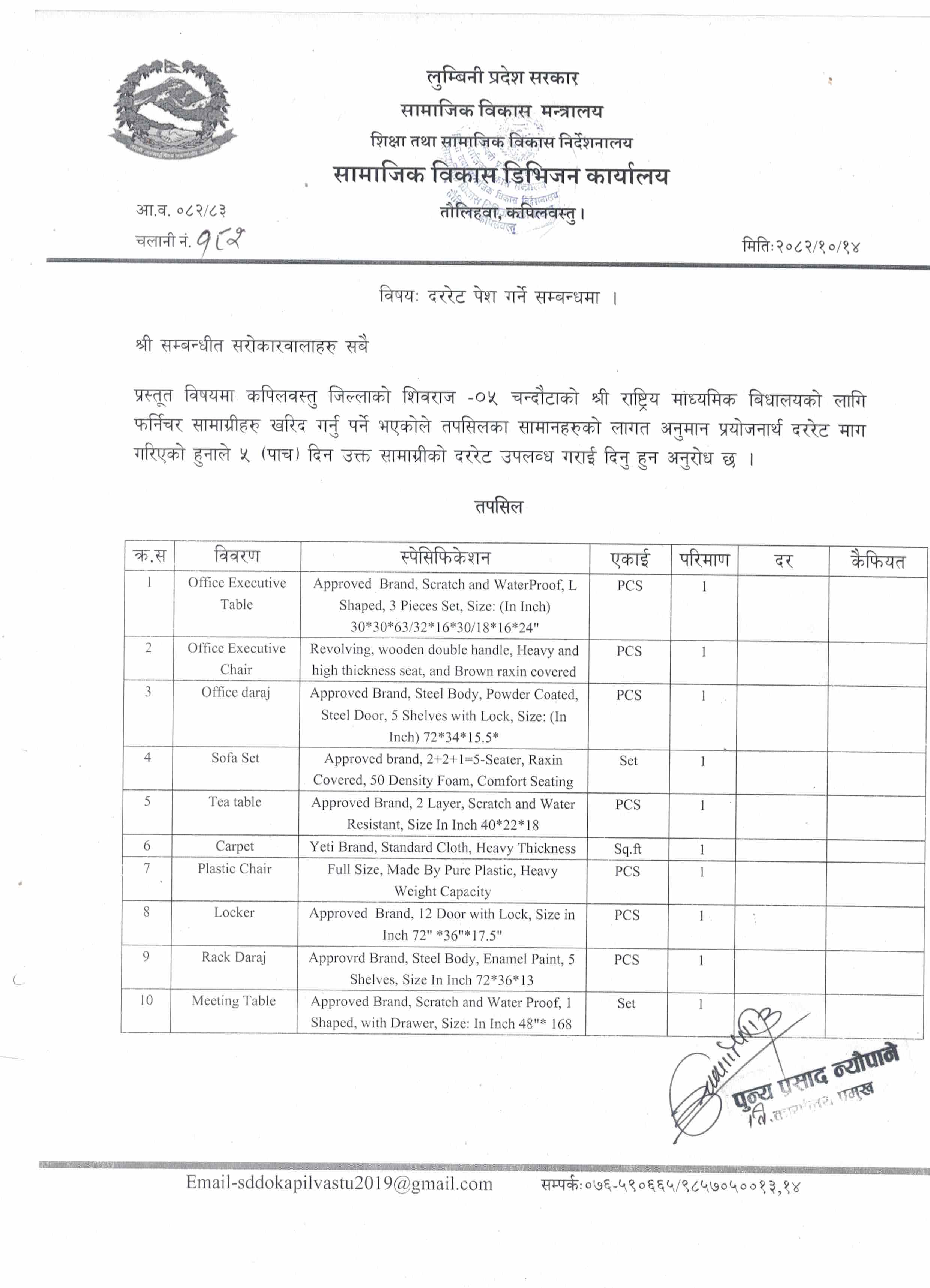 | 22 | प्रस्ताव पेश गर्ने बारेको सूचना । | अन्य | 2082-01-16 | सामाजिक विकास डिभिजन कार्यालय तौलिहवा, कपिलवस्तु । | View |